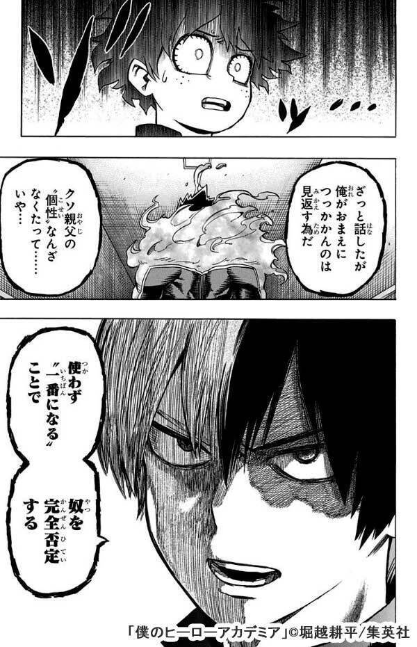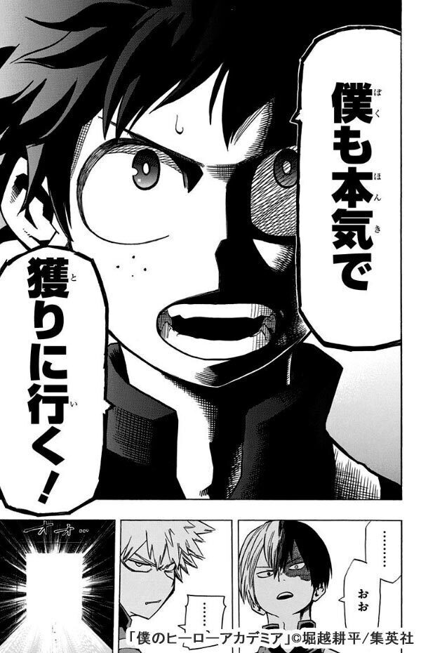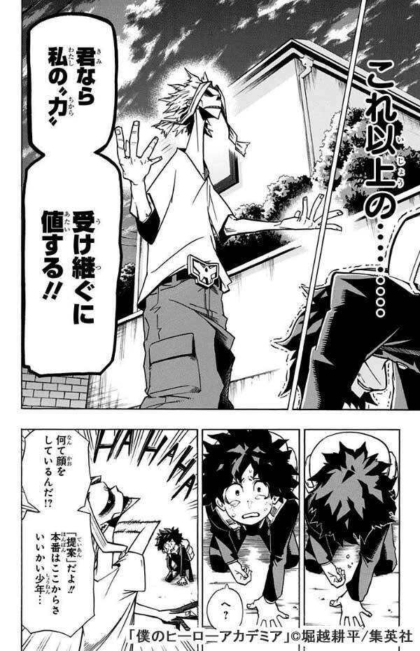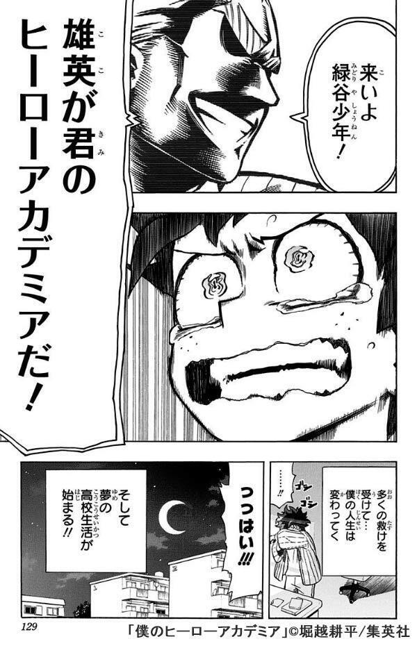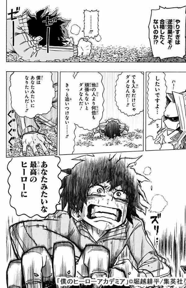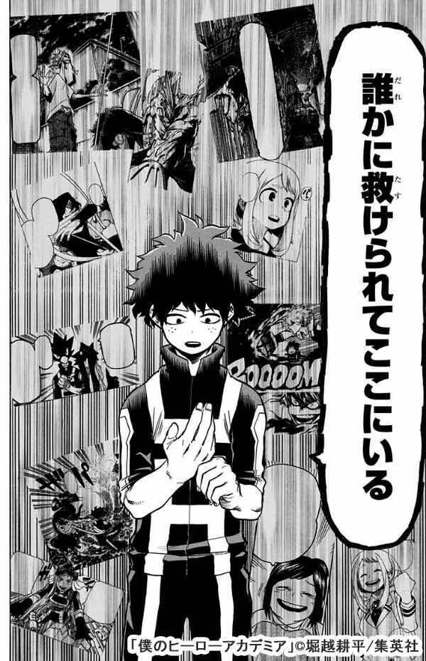 本作には、熱く相手に語る『名言』、自身の不甲斐なさを嘆く『名言』、誰かの為を思ってでる『名言』など沢山の『名言』が誕生します。 大人になって忘れてしまった大切な気持ちを思い出させてくれたり、夢や希望、勇気を失いたくない主人公たちの言葉は読者の心に響かせます。 そんな主人公たちの名言の数々を厳選していくつかご紹介します! 「君はヒーローになれる」 byオールマイト 「倒れねーってのはクソ強ェだろ」 by爆豪勝己 「僕は・・・ずぅっと助けられてきた さっきだってそうだ・・・僕は 僕は誰かに救けられてここにいる」 by緑谷出久 「”やりたい”と相応しいか否かは別の話… 僕は僕の正しいと思う判断をしたまでだ」 by飯田天哉