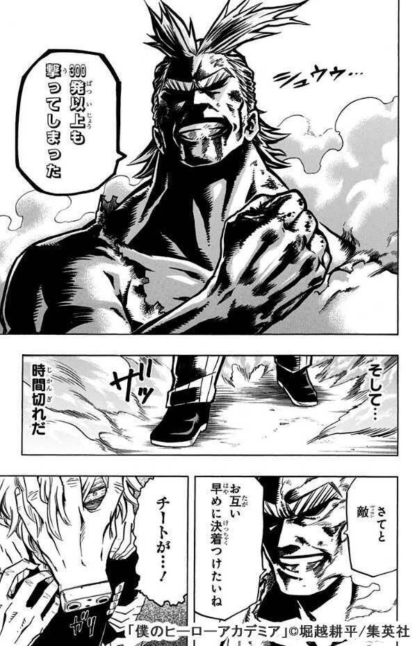「もう大丈夫!何故って!?私が来た!!」 雄英高等学校ヒーロー科教師。 誕生日は6月10日、身長220cm、血液型はA型、出身地は東京都。好きなものは屋久杉と映画。戦闘スタイルは近接戦闘。 前髪をV字に2本逆立てた金髪と筋骨隆々の体格、白い歯を見せた笑顔が特徴。 「平和の象徴」であり、自他ともに認めるNo.1ヒーロー。アメコミ画風の風貌で登場し、時々「画風が違う」と言及される。本作の名言量産機。 “無個性”のデクが見せた勇気にヒーローとしての資質を見出し、彼を自分の後継者とするべく鍛え上げていく。 “個性”は『ワン・フォー・オール』。