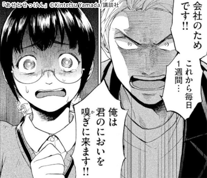 本作の感想や評価を見ていると、次の香太郎の台詞をピックアップしているものが多いようです。 「会社のためです!これから毎日1週間…俺は君のにおいを嗅ぎにきます!」 ものすごくインパクトのある台詞ですね。こんな出会い方をするシチュエーションの漫画はなかなかありません。 麻子が重度の汗っかきであることにコンプレックスを持っていることもあって、これからどうなっていくのかという期待が、読めば読むほど膨らんでいきます。