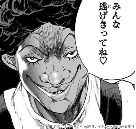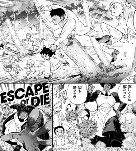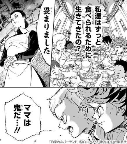 里親が見つかり、外の世界に出ることになったコニーがお気に入りの人形を置き忘れていたため、届けてあげようと後を追ったエマとノーマン。しかし二人は、近づくことを禁じられていた「門」でコニーが食肉として出荷される瞬間を目撃してしまう──。 人間の子どもをランク付けして食う"鬼"という設定、信じていた孤児院のママが実は鬼とグルで子どもたちを鬼に食わせるためだけに愛情をかけて育てているという異常さ…。 物語冒頭ののどかで平和な日常風景からのこの展開が本当に怖い! 他にもホルマリン漬けっぽい女の子の絵がドドンと出てくるなど、これはジャンプで掲載して大丈夫なのか…?と心配になるような描写もありますが、この「少年ジャンプ」という巨大なブランドの中にあっても、そのカラーに縛られない自由な作風と独自の路線こそが最大の魅力。 海外ドラマを思わせる壮絶な心理戦描写に引きこまれる人が続出中です。 これ以上の驚きがあるのか?と思うほど1話からショッキングな場面が登場しますが、ご安心ください。回を追うごとに明らかになる事実と新展開に息つく間もない程のめりこまされてしまうはず。 残酷な事実に気付いたことを隠して逃げようとする子どもたちと、気付かれたことを察してそれを阻止しようとする"ママ"との駆け引きにもゾクゾクします!