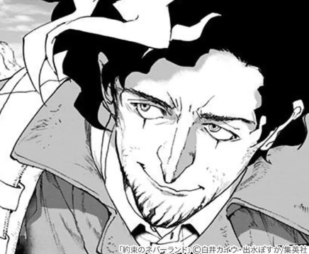 エマ達が農園から脱出し、辿りついたシェルターで出会った大人の男性。長らく名前を明かさず、エマ達からは「オジサン」と呼ばれていたが、96話にてついに名前が判明。 認識番号はETR3M8。出身農園はグローリー=ベル。識別番号はお腹にある。 脱走した食用児という意味では、エマたちの「先輩」。 13年間たった一人でシェルターにこもっており、出会った当初は素行が悪く、助けを求めたエマたちを追い出そうとする。