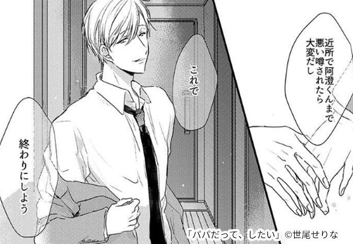 育児と仕事に打ち込む成瀬を支えたい、自分にできることをしたいと気持ちをストレートに伝える阿澄。そんな阿澄に成瀬も心を開いていき、ついに2人は体の関係を結びます。 仕事としてだけではなく成瀬のそばにいたいと願う阿澄と、阿澄に引かれながらも相手の未来を奪いたくないと考える成瀬。別れたときに壱佳に悲しい思いをさせたくないという、父親ならではの気持ちも葛藤します。 阿澄が年下の大学生であることや男同士であるということ、さまざまな葛藤や戸惑いを乗り越えて次第にエスカレートしていく恋の行方が、どのような結末になるのか必見です。