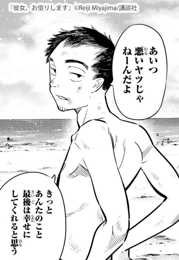 和也の大学の友人であり、千鶴が"レンタル彼女"ということを知っている数少ない友人です。 一見すると軽薄な人物に見え、和也からも口は軽いと思われていますが、千鶴と和也の関係については周囲に秘密にしています。