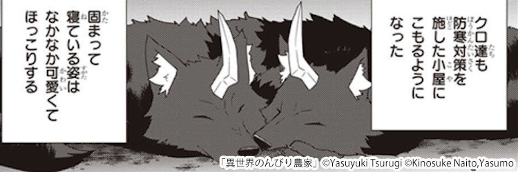 火楽の作っていた畑に現れたウルフ族で、火楽に食事や寝床を提供されたことで懐き、彼と行動を共にするようになります。 クロが雄で、ユキが雌であり、ユキの方は火楽と出会った時点で出産を控えた体でした。やがて4匹のインフェルノウルフが生まれ、それぞれ健やかに育っていきます。 村においては、警備や見回り、また火楽の護衛を務めていることが多く、火楽のことは主として認めているようです。
