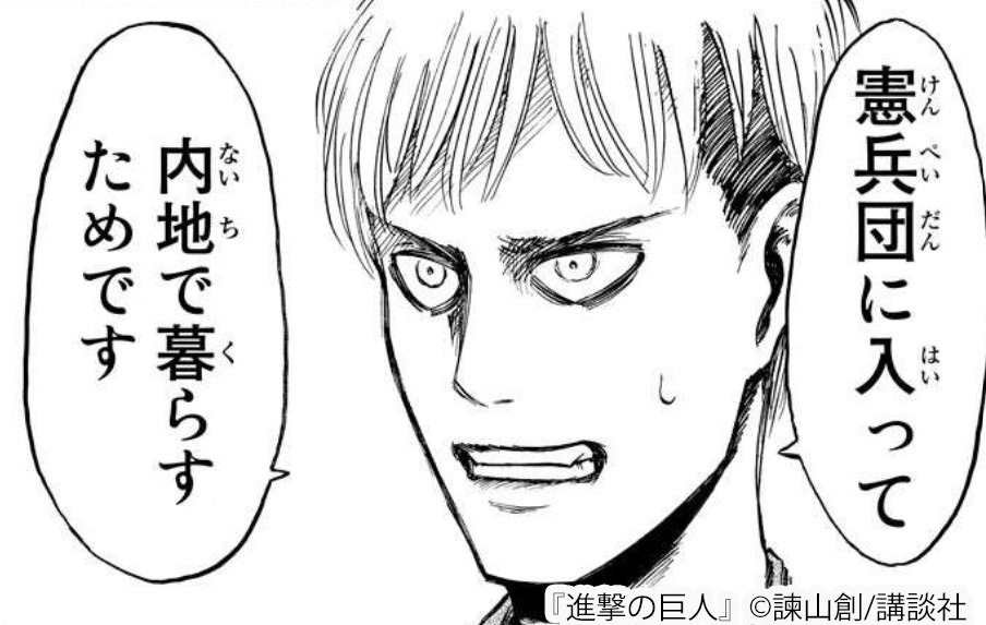 ウォールマリア南東の山村出身で、故郷に帰るという強い意志を持ちます。同期のクリスタに恋をしており、心の中で結婚を申し込むほどです。 同期の中でも群を抜く身体能力を持ち、ミカサに次ぐ2番目の成績で訓練兵団を卒業。責任感が強く、面倒見も良い兄貴分的な性格で、同期からも慕われています。 巨人に囲まれても取り乱さない、強い精神力を持つのも特徴です。