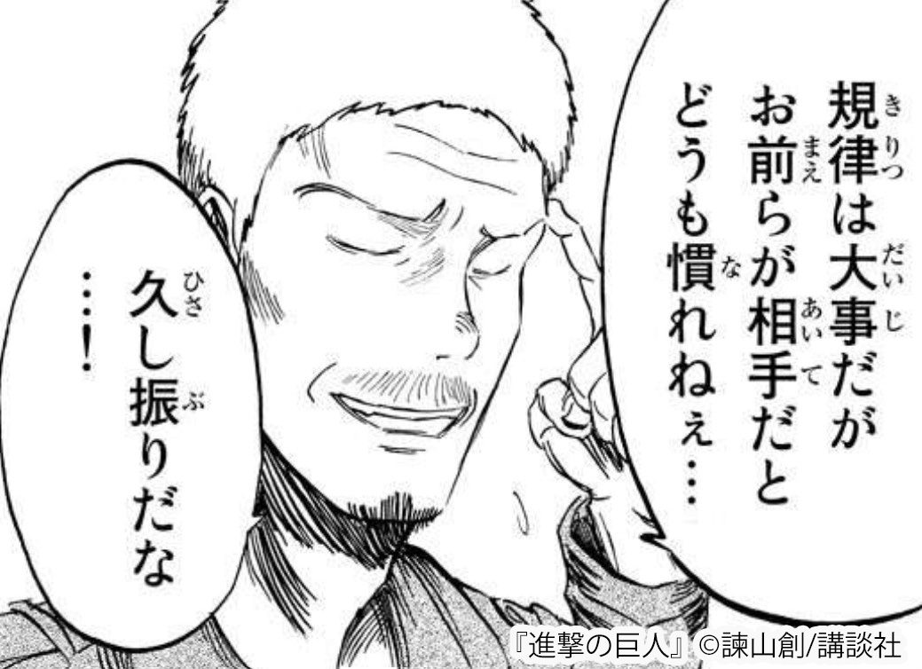 スキンヘッドとひげが特徴的な、駐屯兵団の司令官です。酒が好きで、いつもスキットルを持ち歩いています。 柔軟な思考を持ち、新兵のアルミンの意見も受け入れます。エレンの巨人化の能力を活かして、破壊された壁を防ぐ作戦を敢行しました。 壁の上から巨人を見て、「超絶美女の巨人なら喰われてもいい」と発言する、変人な一面もあります。