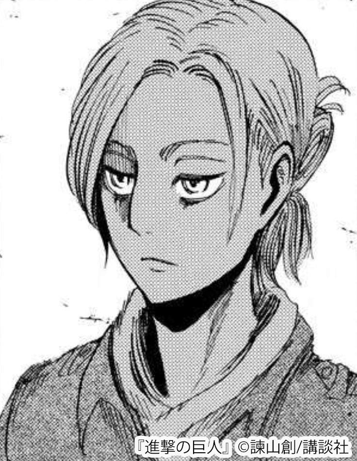 父の教育により優れた戦闘能力を有し、4番目の成績で訓練兵団を卒業しました。組み手の訓練では、エレンやライナーをも倒すほどの実力です。 集団行動が苦手で孤立しがちでしたが、エレンの熱心さに動かされ、蹴り技を伝授するシーンも見られました。 他の訓練兵が志望を憲兵団から調査兵団に切り替える中、最後まで一貫して憲兵団を希望しそのまま入団します。クールなキャラで感情表現が乏しく、合理主義者です。