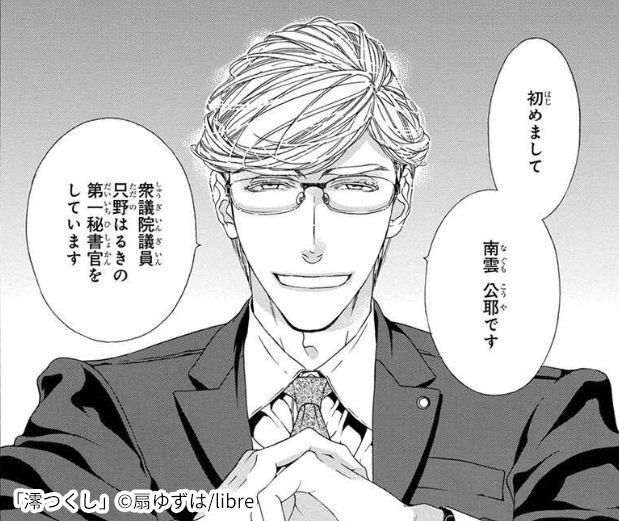恐ろしく頭の切れる34歳の政治家参謀です。野心家としての一面もあり、目的達成のためなら手段を選びません。10年前に区議として活動していた只野はるきに運転手として拾われた後、彼と共に出世を果たしていきました。 自身の過去と自身の過去を知るもの全てを消してきたため、南雲の存在は全て謎に包まれています。その徹底ぶりは、ネットワーク上に彼のデータが全く残っていないほどです。