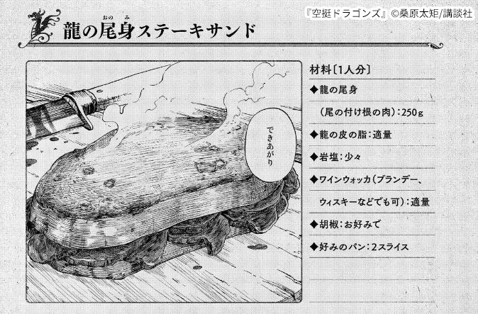 この作品は、龍を使ったおいしそうな料理が数多く出てきます。調理法は煮たり焼いたりとシンプルですが、カツレツやステーキサンドなど現実にありそうな料理が出てきます。また、作中では龍の肉を燻製にして食べる様子のほかに、新鮮な龍の肉は生の状態でも美味しく食べることができます。