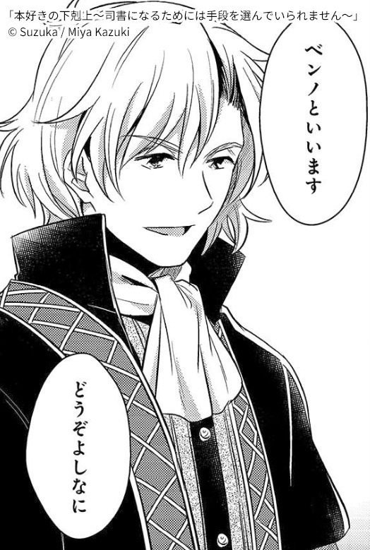 ギルベルタ商会の店主であるベンノは、マインの商人時代の師匠でもあります。服飾や装飾を行うギルベルタ商会で、マインの作ったさまざまなアイテムを商品として売っています。 マインの才能を高く買っており、マインの異質な能力をいち早く見出した人物です。第二の父のようにマインを見守りながらも、商人として対等に交渉できるマインを認めています。商売になりそうな物を見つける勘が鋭く、やり手の商人でもあります。
