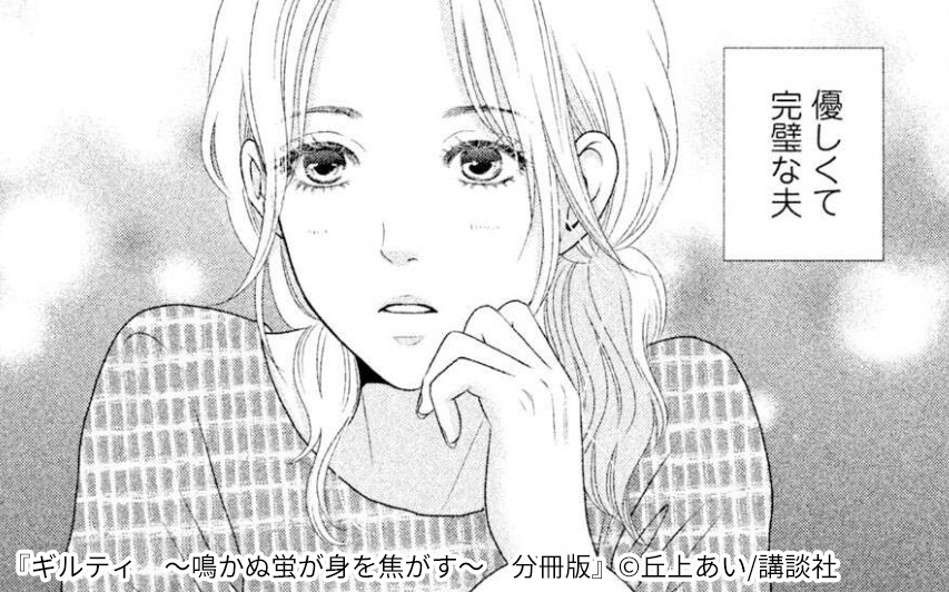 『ギルティ〜鳴かぬ蛍が身を焦がす〜』は夫婦を中心とした泥沼の人間関係を描いたラブサスペンス漫画です。 作者である丘上あいさんは第9回デザート新人まんが大賞で佳作を受賞した後、2001年に雑誌『THEデザート』にて『ハニー!!』という作品でデビューしました。 この作品を皮切りに丘上あいさんは『赤ちゃんホスト』や『ネコろび八起き』など多くの作品を発表していきます。 『ギルティ〜鳴かぬ蛍が身を焦がす〜』は2017年9月15日からコミック配信サービス『まんが王国』で配信が始まりました。また作品は2021年8月の時点では連載中であり、コミックスは8巻まで発売しています。