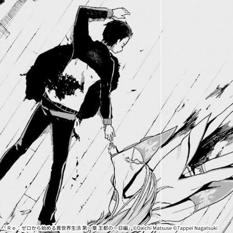 引きこもりの男子高校生、ナツキ・スバルは、ある日コンビニから帰る道で別の世界に転移してしまいます。辿り着いたのはファンタジーな異世界でしたが、スバルは路地裏でチンピラたちにカツアゲされ、あやうく殺されそうになります。 そこにあらわれてスバルを助けたのは、エミリアという少女でした。彼女は無くした徽章を探しており、チンピラたちから助けてもらったお礼をするために、盗賊の盗品蔵に二人で行きます。しかし、そこで二人は何者かに殺されてしまうのでした。 スバルは最初に転移した地点で目を覚まし、自分には"死に戻り"というタイムリープ能力があることに気づきます。スバルはこの能力を使って、エミリアを守りながら徽章を取り戻す方法を探し始めました。