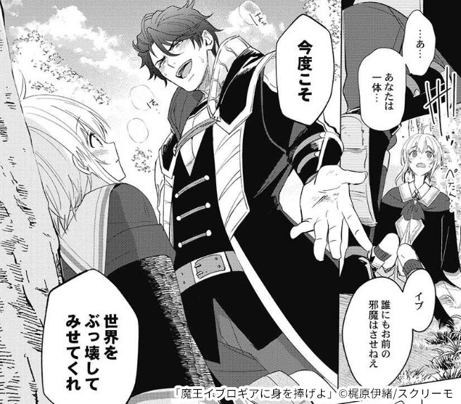 復讐や欲望のため世界を恨み、戦う魔王に憧れている現代人です。銃で撃たれたことをきっかけに、イブロギアたちの生活するゲームの世界へ転生してきました。 兵士のような格好が似合う、屈強な体を持つオラオラ系男子です。世界を動かすのは強力な力だと信じて疑わず、自身も暗殺者を一撃で殴り倒すような力を持ち合わせています。 一方で、筋の通っていないことを嫌う側面も持っています。イブロギアの力に恐れをなし、暗殺をもくろむイブロギアの両親に嫌悪感を抱き、鉄槌を下すシーンもありました。 世界を破壊する力を持つイブロギアにぞっこんで、その思いの強さから自信満々に告白をしてしまうほどです。