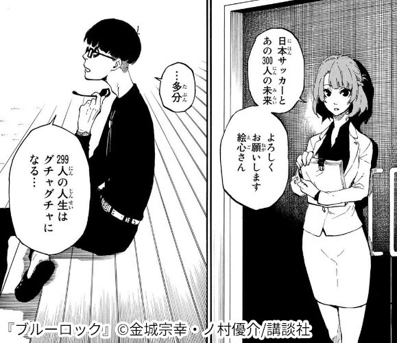 『ブルーロック』は、W杯優勝のために必要な“最強のストライカー”を育成すべく集められた高校生たちが、互いに競い合うスポーツ漫画です。 本作は『週刊少年マガジン』にて2018年8月から連載が始まりました。 原作は金城宗幸、作画はノ村優介が担当しています。金城宗幸は本作の他にも『神さまの言うとおり』や『僕たちがやりました』など、多くのヒット作を生み出している作家です。