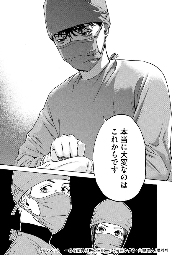 アンメットの魅力のひとつは、手術後の患者にフォーカスを当てている点です。 手術終了後の三瓶が「本当に大変なのはこれからです」と言うように、後遺症を抱えた患者と向き合うことも脳外科医の仕事のひとつです。患者それぞれの人生ドラマを中心に物語が展開されていき、そのひとつひとつに胸を打たれること間違いなしです。